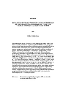 ABSTRAK Budidaya tanaman jagung (Zea Mays L.) pada lahan kering masam, seperti tanah Ultisol memiliki produktivitas yang belum optimal. Oleh karena itu, penggunaan bahan pembenah tanah dan pemupukan diharapkan mampu meningkatkan kualitas tanah. Penelitian ini bertujuan untuk melihat kemantapan agregat tanah pada tanaman jagung akibat aplikasi residu bahan pembenah tanah dan pemupukan N, P, dan K. Penelitian ini dilakukan di Laboratorium Lapang Terpadu (LTPD), Fakultas Pertanian, Universitas Lampung. Penelitian ini dilakukan dengan menggunakan Rancangan Acak Kelompok (RAK) yang disusun secara faktorial dengan dua faktor perlakuan. Faktor pertama yaitu residu biochar (B), terdiri dari 4 taraf yaitu B0 : tanpa residu biochar (0 Mg ha-1 ) ; B1 : residu biochar sekam padi + pukan sapi (5 Mg ha-1 ) ; B2 : residu biochar tongkol jagung + pukan sapi (5 Mg ha-1 ) ; B3 : residu biochar batang singkong + pukan sapi (5 Mg ha-1 ). Faktor kedua yaitu dosis pemupukan (P), terdiri dari 3 taraf yaitu P0 : tanpa pemupukan ; P1 : 1⁄2 dosis pemupukan (Urea 225 Kg ha-1 , SP-36 112,5 Kg ha-1 , dan KCl 0 Kg ha-1 ) ; P2 :1 dosis pemupukan (Urea 450 Kg ha-1 , SP-36 225 Kg ha-1 , dan KCl 0 Kg ha-1 ). Hasil penelitian menunjukkan bahwa kemantapan agregat tanah dengan perlakuan residu bahan pembenah tanah berpengaruh nyata dengan harkat sangat mantap, sedangkan perlakuan dosis pemupukan N, P, dan K tidak berpengaruh nyata. Interaksi kedua perlakuan tersebut berpengaruh sangat nyata terhadap kemantapan agregat tanah dengan kombinasi perlakuan terbaik pada B2 (residu biochar tongkol jagung) dan P2 (1 dosis pemupukan). Kata kunci : Kemantapan agregat tanah, pemupukan N, P, dan K, residu pembenah tanah, tanah Ultisol ABSTRACT The cultivation of corn (Zea mays L.) on acidic dry land, such as Ultisol, has not yet reached its optimal productivity. Therefore, the application of soil amendments and fertilization is expected to improve soil quality. This study aimed to evaluate soil aggregate stability in corn cultivation as affected by the application of residual soil amendments and N, P, and K fertilization. The research was conducted at the Integrated Field Laboratory (LTPD), Faculty of Agriculture, University of Lampung. The experiment was arranged in a factorial Completely Randomized Block Design (CRBD) with two treatment factors. The first factor was biochar residue (B), consisting of four levels: B0: without biochar residue (0 Mg ha−1); B1: rice husk biochar residue + cattle manure (5 Mg ha−1); B2: corn cob biochar residue + cattle manure (5 Mg ha−1); and B3: cassava stem biochar residue + cattle manure (5 Mg ha−1). The second factor was fertilizer dosage (P), consisting of three levels: P0: without fertilization; P1: 1⁄2 fertilizer dose (225 kg ha−1 Urea, 112.5 kg ha−1 SP-36, and 0 kg ha−1 KCl); and P2: 1 full fertilizer dose (450 kg ha−1 Urea, 225 kg ha−1 SP-36, and 0 kg ha−1 KCl). The results showed that the application of soil amendment residues had a significant effect on soil aggregate stability, reaching a very stable category. In contrast, the application of N, P, and K fertilizers had no significant effect. The interaction between both treatments showed a highly significant effect on soil aggregate stability, with the best treatment combination found in B2 (corn cob biochar residue) and P2 (1 full fertilizer dose). Keywords : N, P, and K fertilization, residual soil amendments, soil aggregates stablility, Ultisol soil