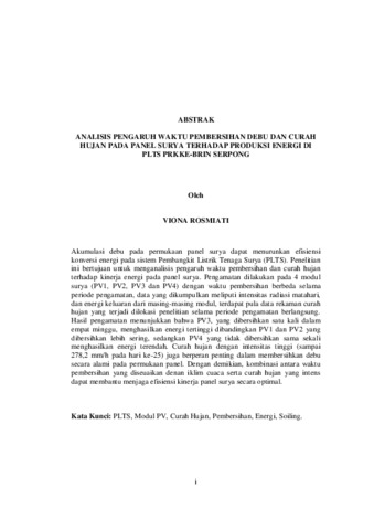 VIONA, ROSMIATI (2025) ANALISIS PENGARUH WAKTU PEMBERSIHAN DEBU DAN CURAH HUJAN PADA PANEL SURYA TERHADAP PRODUKSI ENERGI DI PLTS PRKKE-BRIN SERPONG. FAKULTAS MATEMATIKA DAN ILMU PENGETAHUAN ALAM, UNIVERSITAS LAMPUNG.