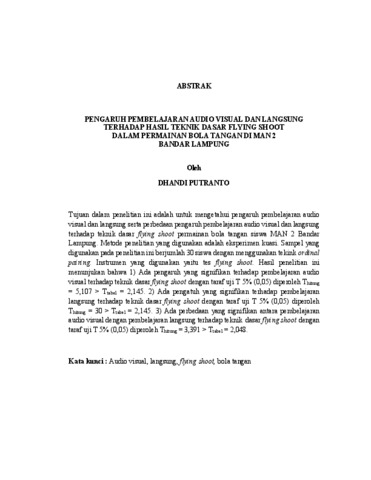 Tujuan dalam penelitian ini adalah untuk mengetahui pengaruh pembelajaran audio visual dan langsung serta perbedaan pengaruh pembelajaran audio visual dan langsung terhadap teknik dasar flying shoot permainan bola tangan siswa MAN 2 Bandar Lampung. Metode penelitian yang digunakan adalah eksperimen kuasi. Sampel yang digunakan pada penelitian ini berjumlah 30 siswa dengan menggunakan tekink ordinal pairing. Instrumen yang digunakan yaitu tes flying shoot. Hasil penelitian ini menunjukan bahwa 1) Ada pengaruh yang signifikan terhadap pembelajaran audio visual terhadap teknik dasar flying shoot dengan taraf uji T 5% (0,05) diperoleh Thitung = 5,107 > Ttabel = 2,145. 2) Ada pengatuh yang signifikan terhadap pembelajaran langsung terhadap teknik dasar flying shoot dengan taraf uji T 5% (0,05) diperoleh Thitung = 30 > Ttabel = 2,145. 3) Ada perbedaan yang signifikan antara pembelajaran audio visual dengan pembelajaran langsung terhadap teknik dasar flying shoot dengan taraf uji T 5% (0,05) diperoleh Thitung = 3,391 > Ttabel = 2,048. Kata kunci : Audio visual, langsung, flying shoot, bola tangan