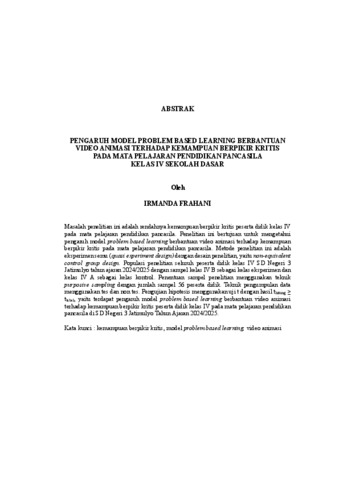 IRMANDA , FRAHANI (2025) PENGARUH MODEL PROBLEM BASED LEARNING BERBANTUAN VIDEO ANIMASI TERHADAP KEMAMPUAN BERPIKIR KRITIS PADA MATA PELAJARAN PENDIDIKAN PANCASILA KELAS IV SEKOLAH DASAR. FAKULTAS KEGURUAN DAN ILMU PENDIDIKAN, UNIVERSITAS LAMPUNG.