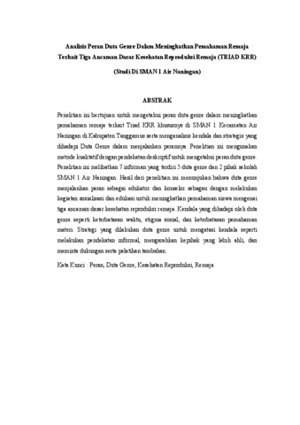 Penelitian ini bertujuan untuk mengetahui peran duta genre dalam meningkatkan pemahaman remaja terkait Triad KRR khususnys di SMAN 1 Kecamatan Air Naningan di Kabupaten Tanggamus serta menganalisis kendala dan strategis yang dihadapi Duta Genre dalam menjalankan perannya. Penelitian ini mengunakan metode kualitatif dengan pendekatan deskriptif untuk mengetahui peran duta genre. Penelitian ini melibatkan 7 informan yang terdiri 5 duta genre dan 2 pihak sekolah SMAN 1 Air Naningan. Hasil dari penelitian ini menunjukan bahwa duta genre menjalankan peran sebagai edukator dan konselor sebagau dengan melakukan kegiatan sosialisasi dan edukasi untuk meningkatkan pemahaman siswa mengenai tiga ancaman dasar kesehatan reproduksi remaja. Kendala yang dihadapi oleh duta genre seperti keterbatasan waktu, stigma sosial, dan keterbatasan pemahaman materi. Strategi yang dilakukan duta genre untuk mengatasi kendala seperti melakukan pendekatan informal, mengarahkan kepihak yang lebih ahli, dan meminta dukungan serta pelatihan tambahan. Kata Kunci : Peran, Duta Genre, Kesehatan Reproduksi, Remaja This study aims to examine the role of GenRe Ambassadors in improving adolescents’ understanding of the Triad of Adolescent Reproductive Health (Triad KRR), particularly at SMAN 1 Air Naningan in Tanggamus Regency, as well as to analyze the challenges and strategies faced by the GenRe Ambassadors in fulfilling their roles. This research uses a qualitative method with a descriptive approach to explore the role of GenRe Ambassadors. The study involved seven informants, consisting of five GenRe Ambassadors and two school representatives from SMAN 1 Air Naningan. The results of this study indicate that GenRe Ambassadors play roles as educators and counselors by conducting socialization and educational activities to increase students' understanding of the three primary threats to adolescent reproductive health. The challenges they face include time constraints, social stigma, and limited understanding of the subject matter. To address these issues, GenRe Ambassadors implement strategies such as using informal approaches, referring students to more qualified experts, and seeking additional training and support. Keywords: Role, GenRe Ambassador, Reproductive Health, Adolescents