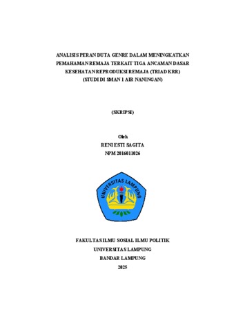 RENI, ESTI SAGITA (2025) ANALISIS PERAN DUTA GENRE DALAM MENINGKATKAN PEMAHAMAN REMAJA TERKAIT TIGA ANCAMAN DASAR KESEHATAN REPRODUKSI REMAJA (TRIAD KRR) (STUDI DI SMAN 1 AIR NANINGAN). FAKULTAS ILMU SOSIAL DAN ILMU POLITIK, UNIVERSITAS LAMPUNG.