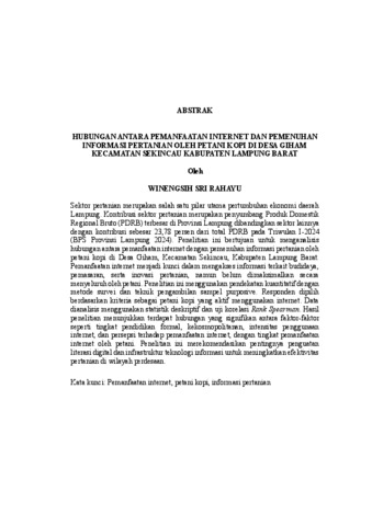 Winengsih Sri , Rahayu (2025) HUBUNGAN ANTARA PEMANFAATAN INTERNET DAN PEMENUHAN INFORMASI PERTANIAN OLEH PETANI KOPI DI DESA GIHAM KECAMATAN SEKINCAU KABUPATEN LAMPUNG BARAT. FAKULTAS PERTANIAN, UNIVERSITAS LAMPUNG.