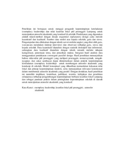 Penelitian ini bertujuan untuk menguji pengaruh kepemimpinan keteladanan (exemplary leadership) dan nilai kearifan lokal piil pesenggiri Lampung untuk menciptakan atmosfer akademik yang kondusif di sekolah. Pendekatan yang digunakan adalah mixed-method dengan desain sequential explanatory design yaitu metode kuantitatif dan kualitatif. Sumber data terdiri atas kepala sekolah, guru dan siswa. Pengumpulan data dilakukan dengan teknik survei melalui angket yang diisi oleh guru, wawancara mendalam (indeep interview) dan observasi terhadap guru, siswa dan kepala sekolah. Data kuantitatif dianalisis dengan statistik deskriptif dan inferensial, sedangkan data kualitatif dianalisis dengan teknik tematik melalui tahapan kategorisasi, penemuan tema, dan penarikan makna. Integrasi hasil analisis data menggunakan pendekatan convergent parallel design. Hasil penelitian menunjukkan bahwa nilai-nilai piil pesenggiri yang meliputi pesenggiri, nemui-nyimah, nengah-nyappur, dan sakai sambayan dapat diinternalisasi dalam praktik kepemimpinan keteladanan (exemplary leadership) untuk membangun atmosfer akademik yang kondusip di sekolah. Model konseptual yang dihasilkan memadukan kekuatan nilai lokal dan prinsip kepemimpinan modern, serta menunjukkan relevansi kontekstual dalam membentuk atmosfer akademik yang positif. Dengan demikian, hasil penelitian ini memiliki implikasi, kontribusi, publikasi, teoretis, kebijakan dan penelitian selanjutnya terhadap pengembangan kepemimpinan berbasis kearifan lokal Lampung dan sebagai panduan praktis dalam peningkatan kepemimpinan sekolah di daerah untuk menciptakan atmosfer akademik yang kondusif. Kata Kunci : exemplary leadership, kearifan lokal piil pesenggiri, atmosfer akademik