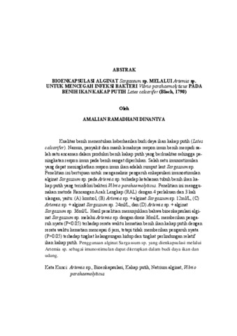 AMALIAN , RAMADHANI DINANTYA (2025) BIOENKAPSULASI ALGINAT Sargassum sp. MELALUI Artemia sp. UNTUK MENCEGAH INFEKSI BAKTERI Vibrio parahaemolyticus PADA BENIH IKAN KAKAP PUTIH Lates calcarifer (Bloch, 1790). FAKULTAS PERTANIAN, UNIVERSITAS LAMPUNG.