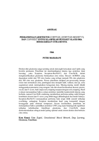 Deteksi dini glaukoma sangat penting untuk mencegah kerusakan saraf optik yang bersifat permanen. Penelitian ini membandingkan kinerja tiga arsitektur deep learning, yaitu Xception, Inception-ResNetV2, dan ConvNeXt, dalam mengklasifikasikan glaukoma berdasarkan citra retina. Dataset ACRIMA yang digunakan terdiri dari 705 citra fundus yang terbagi menjadi 396 citra glaukoma dan 309 citra non glaukoma. Proses penelitian meliputi pre-processing berupa resize dan normalisasi citra, pembagian data menjadi latih, validasi, dan uji, serta augmentasi untuk meningkatkan keragaman data. Masing-masing model dilatih menggunakan parameter yang seragam, lalu dievaluasi berdasarkan akurasi, presisi, recall, dan f1-score, baik tanpa early stopping maupun dengan early stopping. Hasil evaluasi menunjukkan bahwa setiap arsitektur memiliki karakteristik kinerja yang berbeda, namun ConvNeXt cenderung memberikan performa paling stabil dengan kombinasi akurasi dan f1-score yang lebih tinggi dibandingkan dua model lainnya. Inception-ResNetV2 menunjukkan performa baik tetapi lebih sensitif terhadap overfitting, sedangkan Xception memberikan hasil yang kompetitif dengan keunggulan pada efisiensi komputasi. Secara keseluruhan, penelitian ini menunjukkan bahwa pemilihan arsitektur CNN yang tepat berpengaruh signifikan terhadap keberhasilan klasifikasi glaukoma, dan ConvNeXt dapat direkomendasikan sebagai model paling optimal untuk sistem deteksi dini berbasis citra retina. Kata Kunci: Citra Digital, Convolutional Neural Network, Deep Learning, Glaukoma, Klasifikasi.