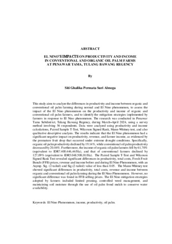 Siti, Ghalika Permata Suri Almega (2025) DAMPAK FENOMENA EL NINO TERHADAP PRODUKTIVITAS DAN PENDAPATAN PADA USAHATANI KELAPA SAWIT KONVENSIONAL DAN ORGANIK DI PENAWAR TAMA, KAB. TULANG BAWANG. Masters thesis, UNIVERSITAS LAMPUNG.