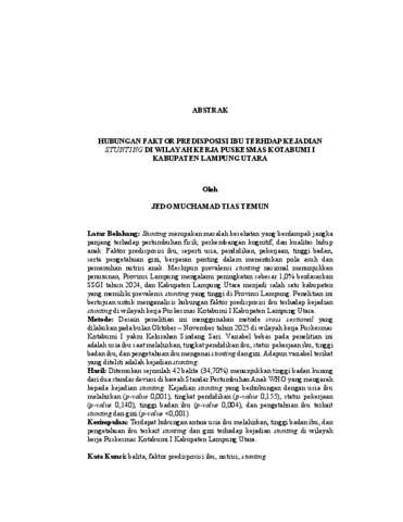 JEDO MUCHAMAD TIAS, TEMUN (2025) HUBUNGAN FAKTOR PREDISPOSISI IBU TERHADAP KEJADIAN STUNTING DI WILAYAH KERJA PUSKESMAS KOTABUMI I KABUPATEN LAMPUNG UTARA. FAKULTAS KEDOKTERAN, UNIVERSITAS LAMPUNG.