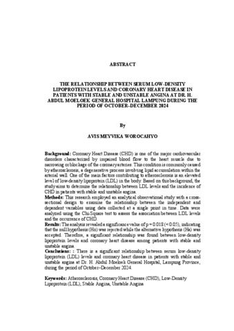 Avis Meyvika, Worocahyo (2025) HUBUNGAN KADAR LOW DENSITY LIPOPROTEIN DALAM SERUM DENGAN PENYAKIT JANTUNG KORONER PADA PASIEN STABLE DAN UNSTABLE ANGINA DI RSUD DR. H. ABDUL MOELOEK PROVINSI LAMPUNG PERIODE OKTOBER-DESEMBER 2024. FAKULTAS KEDOKTERAN, UNIVERSITAS LAMPUNG.