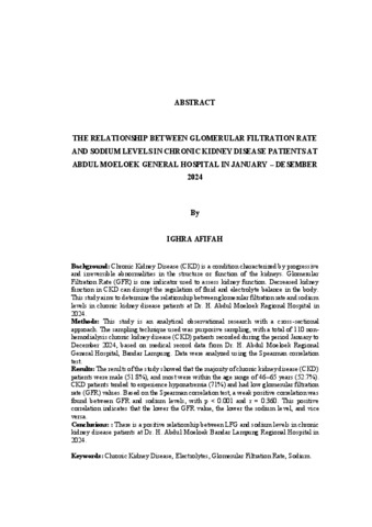 Latar Belakang: Penyakit Ginjal Kronik (PGK) adalah suatu kondisi terjadinya kelainan pada struktur atau fungsi ginjal yang bersifat progresif dan irreversible. Laju Filtrasi Glomerulus (LFG) merupakan salah satu indikator yang dapat digunakan dalam menilai fungsi ginjal. Penurunan fungsi ginjal pada PGK dapat menyebabkan terganggunya pengaturan keseimbangan cairan dan elektrolit dalam tubuh. Penelitian ini bertujuan untuk mengetahui hubungan antara laju filtrasi glomerulus dengan kadar natrium pada pasien penyakit ginjal kronik di RSUD Dr. H. Abdul Moeloek tahun 2024. Metode: Penelitian ini merupakan penelitian observasional analitik dengan pendekatan cross sectional. Teknik pengambilan sampel yang digunakan adalah purposive sampling, dengan jumlah sampel yang didapatkan 110 pasien PGK non hemodialisa yang tercatat pada periode Januari – Desember 2024 berdasarkan data rekam medis di RSUD Dr. H. Abdul Moeloek Bandar Lampung. Analisis data dilakukan dengan menggunakan uji Spearmen. Hasil: Hasil penelitian menunjukkan mayoritas pasien PGK didominasi oleh laki laki (51,8%) dan sebagian besar usia berada pada rentang 46-65 tahun (52,7%). Pasien PGK cenderung mengalami hiponatremia (71%) dan nilai LFG yang rendah. Berdasarkan hasil uji spearmen didapatkan adanya hubungan positif yang lemah antara LFG dengan kadar natrium dengan nilai p = <0,001 dan r = 0,360. Hubungan positif menunjukkan semakin rendah nilai LFG maka kadar natrium akan semakin rendah, dan sebaliknya. Kesimpulan: Terdapat hubungan positif antara LFG dengan kadar natrium pada pasien penyakit ginjal kronik di RSUD Dr. H. Abdul Moeloek Bandar Lampung tahun 2024. Kata Kunci: Elektrolit, Laju Filtrasi Glomerulus, Natrium, Penyakit Ginjal Kronik.