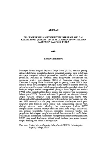 Penerapan Sistem Integrasi Sapi dan Kelapa Sawit (SISKA) semakin penting ditengah kebutuhan peningkatan efisiensi pemanfaatan sumber daya perkebunan dan upaya mengatasi berbagai permasalahan produksi pada sektor sawit dan peternakan. Penelitian ini bertujuan untuk mengevaluasi keberlanjutan dan merancang strategi pengembangan SISKA di Kecamatan Abung Selatan, Kabupaten Lampung Utara. Pemilihan topik ini penting karena SISKA dapat menjadi solusi untuk mengatasi tantangan dalam sektor perkebunan sawit dan peternakan sapi di Indonesia. Metode yang digunakan adalah pendekatan kuantitatif deskriptif dengan analisis menggunakan perangkat lunak Rapfish dan analisis SWOT untuk mengidentifikasi faktor internal dan eksternal yang memengaruhi keberlanjutan SISKA. Populasi terdiri dari 70 peternak dan sebanyak 36 teknik Simple Random Sampling. Hasil penelitian menunjukkan bahwa status keberlanjutan SISKA berada pada kategori “cukup berkelanjutan” dengan skor rata-rata 56,89 menunjukkan nilai yang mencerminkan keberlanjutan masih perlu penguatan pada beberapa atribut sensitif pada masing-masing dimensi yaitu ekologi, ekonomi, sosial, teknologi, dan kelembagaan. Analisis SWOT mengidentifikasi kekuatan utama pemanfaatan limbah sawit sebagai pakan ternak dan peluang peningkatan teknologi, sedangkan kelemahan terletak pada pengelolaan kelembagaan yang belum optimal dan ancaman dari konflik lahan. Penelitian ini memberikan rekomendasi strategis untuk memperkuat implementasi SISKA yang ramah lingkungan, inklusif sosial, berdaya guna secara ekonomi, adaptif teknologi, dan kokoh kelembagaannya. Kata kunci: Sistem Integrasi Sapi dan Kelapa Sawit (SISKA), Keberlanjutan, Rapfish, Strategi, SWOT. abstract SUSTAINABILITY EVALUATION OF THE CATTLE AND OIL PALM INTEGRATION SYSTEM (SISKA) STUDY IN SOUTH ABUNG DISTRICT NORTH LAMPUNG REGENCY By Erisa Pratiwi Harsya The implementation of the Integrated Cattle and Oil Palm System (SISKA) is becoming increasingly important amid the need to enhance the efficiency of plantation resource utilization and to address various production challenges in the oil palm and livestock sectors. This study aims to evaluate the sustainability and design sustainability strategies for the SISKA in Abung Selatan District, North Lampung Regency. The selection of this topic is important because SISKA can serve as a solution to address challenges in Indonesia’s oil palm plantation and cattle farming sectors. The method used is a descriptive quantitative approach, with analysis conducted using Rapfish software and SWOT analysis to identify internal and external factors affecting SISKA’s sustainability. Population consists of 70 farmers, with 36 individuals selected as samples using the Simple Random Sampling technique. The research results indicate that SISKA’s sustainability status falls into the “moderately sustainable” category, with an average score of 56.89, reflecting that sustainability still requires strengthening in several sensitive attributes across the ecological, economic, social, technological, and institutional dimensions. SWOT analysis identifies key strengths in the utilization of oil palm waste as livestock feed and opportunities for technological advancement, while weaknesses lie in suboptimal institutional management and threats from land conflicts. Study provides strategic recommendations to strengthen the implementation of SISKA in an environmentally friendly, socially inclusive, economically viable, technologically adaptive, and strong in terms of institutional capacity. Keywords: Integrated Cattle and Oil Palm System (SISKA), Sustainability, Rapfish, Strategy, SWOT.