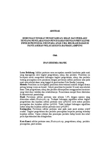 HUBUNGAN TINGKAT PENGETAHUAN, SIKAP,DAN PERILAKU TENTANG PENULARAN DAN PENCEGAHAN DENGAN PREVALENSI INFEKSI PROTOZOA USUS PADA ANAK USIA SEKOLAH DASAR DI PANTI ASUHAN WILAYAH KOTA BANDAR LAMPUNG