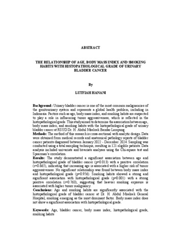 Lutfiah, Hanani (2026) HUBUNGAN USIA, INDEKS MASSA TUBUH DAN KEBIASAAN MEROKOK DENGAN DERAJAT HISTOPATOLOGI KANKER VESIKA URINARIA. FAKULTAS KEDOKTERAN, UNIVERSITAS LAMPUNG .