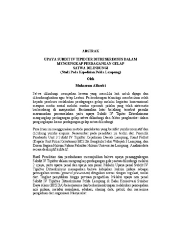 Satwa dilindungi merupakan hewan yang memiliki hak untuk dijaga dan dikembangbiakan agar tetap Lestari. Perkembangan teknologi memberikan celah kepada pemburu melakukan perdagangan gelap melalui kegiatan konvensional maupun media sosial melalui modus operandi pelaku yang telah sistematis berkembang di masyarakat. Berdasarkan latar belakang tersebut penulis merumuskan permasalahan yaitu upaya Subdit IV Tipiter Ditreskrimsus mengungkap perdagangan gelap satwa dilindungi dan faktor penghambat dalam pengungkapan kasus perdagangan gelap satwa dilindungi Penelitian ini menggunakan metode pendekatan yang bersifat yuridis normatif dan didukung yuridis empiris. Narasumber pada penelitian ini terdiri dari Penyidik Pembantu Unit 3 Subdit IV Tipidter Kepolisian Daerah Lampung, Kanit Polhut (Kepala Unit Polisi Kehutanan) BKSDA Bengkulu Seksi Wilayah 3 Lampung, dan Dosen Bagian Hukum Pidana Fakultas Hukum Universitas Lampung. Analisis data secara deskriptif kulitatif. Hasil Penelitian dan pembahasan menunjukkan bahwa upaya penanggulangan Subdit IV Tipidter dalam mengungkap perdagangan gelap satwa dilindungi melalui 2 upaya, yaitu upaya penal dan upaya non penal. Melalui Upaya penal Subdit IV Tipidter Ditreskrimsus menegaskan bahwa kebijakan hukum pidana sebagai pencegahan umum (general prevention) ditegakan sesuai dengan regulasi, mulai dari Tingkat penyidikan hingga putusan pengadilan. Melalui upaya non penal Subdit IV Tipidter Ditreskrimsus Polda Lampung & Balai Konservasi Sumber Daya Alam (BKSDA) bekerjasama dan berkesinambungan melakukan pencegahan non pidana, melalui sosialisasi, edukasi, sharing data, patrol, dan menerima pengaduan dari organisasi Masyarakat. Ada lima faktor penghambat penanggulangan perdagangan gelap satwa dilindungi, salah satunya faktor aparat penegak hukum yang mengalami kekurangan SDM dalam memahami teknik pengungkapan perdagangan gelap satwa. Selain itu, sarana dan prasarana pendukung seperti alat patroli dan pos pengawasan masih belum memadai, menghambat pengawasan di daerah. Adapun saran dalam penelitian ini, diperlukan penguatan kapasitas aparat penegak hukum dan peningkatan sarana prasarana melalui pelatihan teknis serta pemenuhan peralatan patroli dan teknologi pengawasan untuk mendukung penindakan perdagangan gelap satwa dilindungi secara optimal. Selain itu, program edukasi dan sosialisasi intensif kepada masyarakat di Lampung harus dilakukan secara menyeluruh lewat kolaborasi antara Subdit IV Tipidter, BKSDA, organisasi masyarakat sipil, dan media, memanfaatkan teknologi informasi serta media sosial agar kesadaran tentang pentingnya pelestarian satwa Kata Kunci : Upaya Penanggulangan, Perdagangan Gelap, Satwa dilindungi. Protected animals have the right to be protected and bred to ensure their sustainability. Technological developments provide opportunities for poachers to engage in illegal trade through conventional means and social media, using a modus operandi that has systematically developed within society. Based on this background, the author formulates the problem, namely the efforts of Subdit IV Tipidter Ditreskrimsus to uncover the illegal trade in protected animals and the inhibiting factors in uncovering cases of illegal trade in protected animals. This research uses a juridical normative approach supported by empirical juridical methods through applicable legislation, literature studies, and interviews with informants, including Assistant Investigators of Unit 3 Subdit IV Tipidter of the Lampung Regional Police, the Head of Forest Police Unit (Polhut) BKSDA Bengkulu, Lampung Region Section 3, and a Criminal Law Lecturer at the Faculty of Law, University of Lampung. The data is analyzed descriptively qualitatively. The results and discussion show that Subdit IV Tipidter’s efforts to tackle illegal trade of protected wildlife are carried out through two approaches: penal and nonpenal efforts. Through penal efforts, Subdit IV Tipidter Ditreskrimsus enforces general prevention policies in criminal law according to the regulations in Law Number 32 of 2024 on the Conservation of Biological Natural Resources and Their Ecosystems, applicable from the investigation stage to court verdicts. Through nonpenal efforts, Subdit IV Tipidter Ditreskrimsus Lampung Regional Police and BKSDA cooperate continuously in non-criminal prevention by conducting socialization, education, data sharing, patrols, and receiving reports from community organizations. There are five main hindering factors: legislation, law enforcement officers, facilities and infrastructure, society, and culture. In particular, law enforcement officers lack adequate human resources who understand the techniques for uncovering illegal wildlife trade. Additionally, supporting facilities such as patrol equipment and monitoring posts remain inadequate, hindering supervision in several areas. The societal factor is significant due to limited knowledge and education about protected wildlife, especially in Lampung, resulting in low awareness of conservation. These factors are interrelated and become challenges in efforts to eradicate illegal wildlife trade. Based on the findings, this study suggests strengthening the capacity of law enforcement officers and improving facilities and infrastructure through technical training and adequate provision of patrol equipment and surveillance technology to support optimal enforcement against illegal trade of protected wildlife. Furthermore, intensive and comprehensive education and socialization programs for communities in Lampung should be implemented through collaboration between Subdit IV Tipidter, BKSDA, civil society organizations, and media, utilizing information technology and social media to increase awareness of the importance of wildlife conservation and the negative impacts of illegal trade effectively and broadly. Keywords: Enforcement Efforts, Illegal Trade, Protected Wildlife.