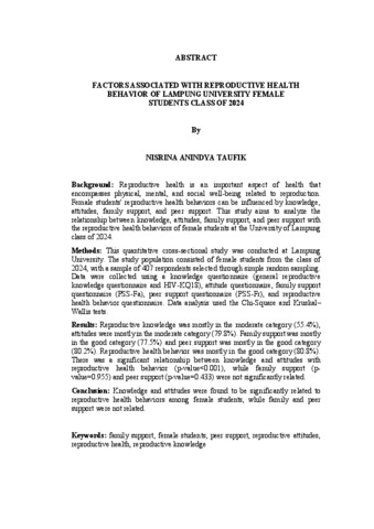 ANINDYA TAUFIK, NISRINA (2026) FAKTOR-FAKTOR YANG BERHUBUNGAN DENGAN PERILAKUKESEHATAN REPRODUKSI MAHASISWI UNIVERSITAS LAMPUNG ANGKATAN 2024. FAKULTAS KEDOKTERAN, UNIVERSITAS LAMPUNG.