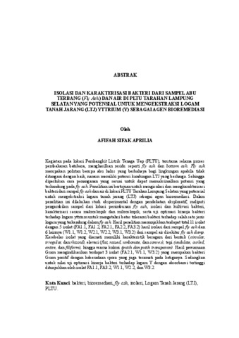 ISOLASI DAN KARAKTERISASI BAKTERI DARI SAMPEL ABU TERBANG (Fly Ash) DAN AIR DI PLTU TARAHAN LAMPUNG SELATAN YANG POTENSIAL UNTUK MENGEKSTRAKSI LOGAM TANAH JARANG (LTJ) YTTRIUM (Y) SEBAGAI AGEN BIOREMEDIASI