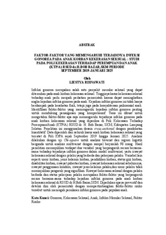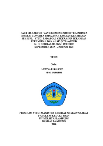 LIESTYA, RISNAWATI (2026) FAKTOR-FAKTOR YANG MEMENGARUHI TERJADINYA INFEKSI GONOREA PADA ANAK KORBAN KEKERASAN SEKSUAL : STUDI PADA POLI KEKERASAN TERHADAP PEREMPUAN DAN ANAK (KTP/A) RSUD dr. H. BOB BAZAR, SKM PERIODE SEPTEMBER 2019 – JANUARI 2025. Masters thesis, UNIVERSITAS LAMPUNG .
