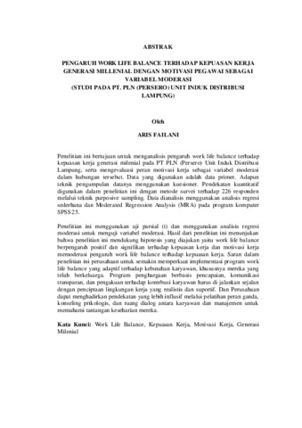 Aris Failani , (2025) PENGARUH WORK LIFE BALANCE TERHADAP KEPUASAN KERJA GENERASI MILLENIAL DENGAN MOTIVASI PEGAWAI SEBAGAI VARIABEL MODERASI (Studi Pada PT. PLN (Persero) Unit Induk Distribusi Lampung). Masters thesis, UNIVERSITAS LAMPUNG.