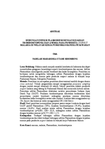 Nabilah , Mahardika Utami Sihombing (2026) HUBUNGAN INFEKSI PLASMODIUM DENGAN KEJADIAN TROMBOSITOPENIA DAN ANEMIA PADA PENDERITA SUSPECT MALARIA DI WILAYAH KERJA PUSKESMAS HANURA PESAWARAN. FAKULTAS KEDOKTERAN, UNIVERSITAS LAMPUNG.