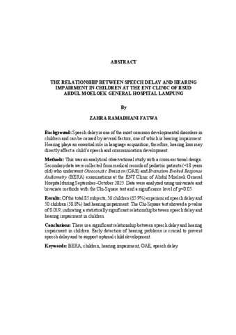 Zahra Ramadhani, Fatwa (2025) HUBUNGAN ANTARA KETERLAMBATAN BICARA DENGAN GANGGUAN PENDENGARAN PADA PASIEN ANAK DI POLI THT RSUD ABDUL MOELOEK PROVINSI LAMPUNG. FAKULTAS KEDOKTERAN, UNIVERSITAS LAMPUNG.