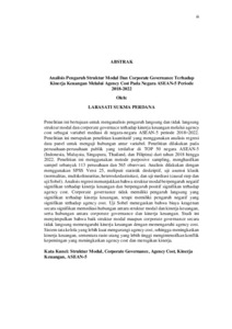 ABSTRAK Penelitian ini bertujuan untuk menganalisis pengaruh langsung dan tidak langsung struktur modal dan corporate governace terhadap kinerja keuangan melalui agency cost sebagai variabel mediasi di negara-negara ASEAN-5 periode 2018–2022. Penelitian ini merupakan penelitian kuantitatif yang menggunakan analisis regresi data panel untuk menguji hubungan antar variabel. Penelitian dilakukan pada perusahaan-perusahaan publik yang terdaftar di TOP 50 negara ASEAN-5 (Indonesia, Malaysia, Singapura, Thailand, dan Filipina) dari tahun 2018 hingga 2022. Penelitian ini menggunakan metode purposive sampling, menghasilkan sampel sebanyak 113 perusahaan dan 565 observasi. Analisis dilakukan dengan menggunakan SPSS Versi 25, meliputi statistik deskriptif, uji asumsi klasik (normalitas, multikolinearitas, heteroskedastisitas), dan uji mediasi (causal step dan uji Sobel). Analisis regresi menunjukkan bahwa struktur modal berpengaruh negatif signifikan terhadap kinerja keuangan dan berpengaruh positif signifikan terhadap agency cost. Corporate governance tidak memiliki pengaruh langsung yang signifikan terhadap kinerja keuangan, tetapi memiliki pengaruh negatif yang signifikan terhadap agency cost. Uji Sobel menegaskan bahwa biaya keagenan secara signifikan memediasi hubungan antara struktur modal dan kinerja keuangan, serta hubungan antara corporate governance dan kinerja keuangan. Studi ini menyimpulkan bahwa baik struktur modal maupun corporate governance secara tidak langsung memengaruhi kinerja keuangan dengan memengaruhi agency cost. Sistem tata kelola yang lebih kuat mengurangi agency cost, sehingga meningkatkan kinerja keuangan, sementara rasio utang yang lebih tinggi mengintensifkan konflik kepentingan yang meningkatkan agency cost dan merugikan kinerja. ABSTRACT This study aims to analyze the direct and indirect effects of capital structure and corporate governance on financial performance through agency cost as a mediating variable in ASEAN-5 countries during the period 2018–2022. This is a quantitative study that uses panel data regression analysis to test the relationship between variables. The research was conducted on public companies listed in the TOP 50 of the ASEAN-5 countries (Indonesia, Malaysia, Singapore, Thailand, and the Philippines) from 2018 to 2022. This study used purposive sampling, resulting in a sample of 113 companies and 565 observations. The analysis was conducted using SPSS Version 25, covering descriptive statistics, classical assumption tests (normality, multicollinearity, heteroscedasticity), and mediation tests (causal step and Sobel test). Regression analysis shows that capital structure has a significant negative effect on financial performance and a significant positive effect on agency cost. Corporate governance does not have a significant direct effect on financial performance, but it has a significant negative effect on agency costs. The Sobel test confirms that agency costs significantly mediate the relationship between capital structure and financial performance, as well as the relationship between corporate governance and financial performance. This study concludes that both capital structure and corporate governance indirectly affect financial performance.