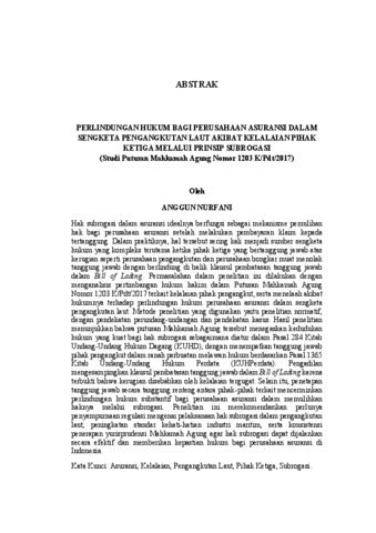 ANGGUN , NURFANI (2026) PERLINDUNGAN HUKUM BAGI PERUSAHAAN ASURANSI DALAM SENGKETA PENGANGKUTAN LAUT AKIBAT KELALAIAN PIHAK KETIGA MELALUI PRINSIP SUBROGASI (Studi Putusan Mahkamah Agung Nomor 1203 K/Pdt/2017). Masters thesis, UNIVERSITAS LAMPUNG.