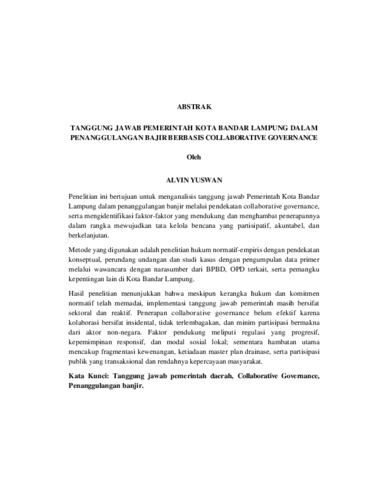 ALVIN , YUSWAN (2026) TANGGUNG JAWAB PEMERINTAH KOTA BANDAR LAMPUNG DALAM PENANGGULANGAN BANJIR BERBASIS COLLABORATIVE GOVERNANCE. Masters thesis, UNIVERSITAS LAMPUNG.