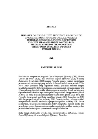 Penelitian ini menganalisis pengaruh Capital Employed Efficiency (CEE), Human Capital Efficiency (HCE), dan Structural Capital Efficiency (SCE) terhadap Sustainable Growth Rate (SGR) dengan Firm Size sebagai variabel kontrol pada perusahaan sektor teknologi yang terdaftar di Bursa Efek Indonesia periode 2021– 2024. Jenis penelitian yang digunakan adalah penelitian asosiatif dengan pendekatan kuantitatif. Data yang digunakan merupakan data sekunder dengan total 52 sampel yang diperoleh melalui teknik purposive sampling. Teknik analisis yang digunakan adalah analisis regresi data panel dengan diolah menggunakan software E-Views 12. Hasil penelitian menunjukkan bahwa secara parsial CEE, HCE, dan Firm Size berpengaruh positif dan signifikan terhadap SGR. Sementara itu, SCE tidak berpengaruh signifikan terhadap SGR. Secara simultan, seluruh variabel independen dan kontrol memberikan pengaruh signifikan terhadap SGR. Secara keseluruhan, penelitian ini menegaskan bahwa penguatan efisiensi modal dan pengelolaan sumber daya manusia merupakan aspek strategis dalam meningkatkan pertumbuhan berkelanjutan perusahaan teknologi di Indonesia. Kata Kunci: Sustainable Growth Rate, Capital Employed Efficiency, Human Capital Efficiency, Structural Capital Efficiency, Firm Size