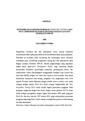 Pengelolaan inventaris dan data administrasi secara manual berpotensi menyebabkan tidak tepatan pencatatan serta keterlambatan dalam proses pelaporan. Penelitian ini bertujuan untuk merancang dan membangun sistem informasi terintegrasi guna mendukung pengelolaan barang dan data administrasi pada Bagian Layanan Kesehatan DPR-RI. Metode pengembangan yang digunakan adalah Rapid Application Development (RAD), yang mencakup tahapan perencanaan kebutuhan, perancangan antarmuka, pembangunan sistem, dan implementasi. Sistem dikembangkan menggunakan kerangka kerja Laravel dan basis data MySQL dengan role admin dan employee serta memiliki fitur utama diantaranya manajemen data barang, pengajuan cuti, pengarsipan surat, serta laporan. Evaluasi sistem dilakukan dengan metode system usability scale untuk menguji tahapan desain, Black Box untuk menguji fungsionalitas dan User Acceptance Testing (UAT) untuk menilai tingkat penerimaan pengguna. Hasil pengujian fungsional dengan dua iterasi, dengan iterasi pertama 94,37% iterasi kedua terdapat peningkatan, dengan tingkat keberhasilan 100% pada pengujian Black Box dan skor rata-rata UAT sebesar 86%. yang menunjukkan penerimaan pengguna yang sangat baik. Sistem mampu meningkatkan proses inventaris barang dan data administrasi. Kata kunci: Sistem Informasi, Inventaris, Administrasi, Laravel, RAD, Black Box Manual management of inventory and administrative data has the potential to cause recording inaccuracies and delays in the reporting process. This research aims to design and develop an integrated information system to support goods management and administrative data at the Health Services Division of the Indonesian House of Representatives (DPR-RI). The development method used is Rapid Application Development (RAD), which includes the stages of requirements planning, interface design, system development, and implementation. The system was developed using the Laravel framework and MySQL database with admin and employee roles, featuring key functionalities including goods data management, leave application, document archiving, and reporting. System evaluation was conducted using the System Usability Scale method to test the design phase, Black Box testing for functionality testing, and User Acceptance Testing (UAT) to assess user acceptance levels. The functional testing results showed two iterations, with the first iteration achieving 94.37% and the second iteration showing improvement, reaching a 100% success rate in Black Box testing and an average UAT score of 86%, indicating very good user acceptance. The system successfully improved inventory goods and administrative data processes. Keywords: Information System, Inventory, Administration, Laravel, RAD