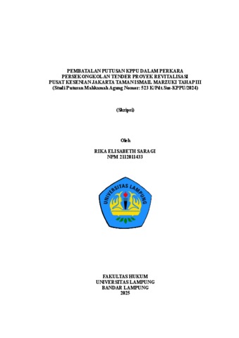 Rika , Elisabeth Saragi (2025) PEMBATALAN PUTUSAN KPPU DALAM PERKARA PERSEKONGKOLAN TENDER PROYEK REVITALISASI PUSAT KESENIAN JAKARTA TAMAN ISMAIL MARZUKI TAHAP III (Studi Putusan Mahkamah Agung Nomor: 523 K/Pdt.Sus-KPPU/2024). FAKULTAS HUKUM, UNIVERSITAS LAMPUNG.
