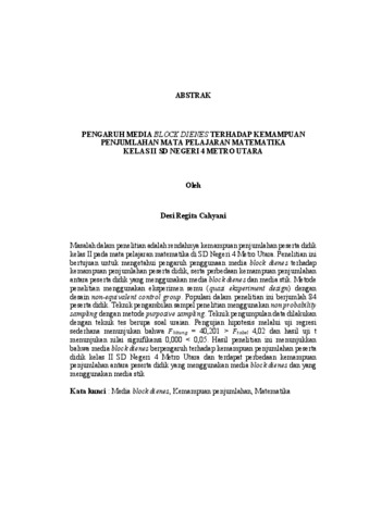 Masalah dalam penelitian adalah rendahnya kemampuan penjumlahan peserta didik kelas II pada mata pelajaran matematika di SD Negeri 4 Metro Utara. Penelitian ini bertujuan untuk mengetahui pengaruh penggunaan media block dienes terhadap kemampuan penjumlahan peserta didik, serta perbedaan kemampuan penjumlahan antara peserta didik yang menggunakan media block dienes dan media stik. Metode penelitian menggunakan eksperimen semu (quasi eksperiment design) dengan desain non-equivalent control group. Populasi dalam penelitian ini berjumlah 84 peserta didik. Teknik pengambilan sampel penelitian menggunakan non probability sampling dengan metode purposive sampling. Teknik pengumpulan data dilakukan dengan teknik tes berupa soal uraian. Pengujian hipotesis melalui uji regresi sederhana menunjukan bahwa Fhitung = 40,201 > Ftabel 4,02 dan hasil uji t menunjukan nilai signifikansi 0,000 < 0,05. Hasil penelitian ini menunjukkan bahwa media block dienes berpengaruh terhadap kemampuan penjumlahan peserta didik kelas II SD Negeri 4 Metro Utara dan terdapat perbedaan kemampuan penjumlahan antara peserta didik yang menggunakan media block dienes dan yang menggunakan media stik Kata kunci : Media block dienes, Kemampuan penjumlahan, Matematika The problem in this study was the low addition skills of second-grade students in mathematics at SD Negeri 4 Metro Utara. This study aimed to determine the effect of using dienes blocks media on students' addition skills, as well as the differences in addition skills between students who used dienes blocks and those who used stick media. The research method employed a quasi-experimental design with a non- equivalent control group design. The population in this study consisted of 84 students. The sampling technique used non-probability sampling with a purposive sampling method. Data were collected using a test in the form of essay questions. Hypothesis testing through simple regression analysis showed that Fcount of 40.201 > Ftable of 4.02, and the t-test results showed a significance value of 0.000 < 0.05. The results of this study indicated that the use of dienes blocks had an effect on the addition skills of second-grade students at SD Negeri 4 Metro Utara, and there was a difference in addition skills between students who used dienes blocks and those who used stick media. Keywords: Dienes blocks media, Addition skills, Mathematics