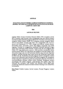 AGUNGAN , SULTONI (2025) KUALITAS LAYANAN MOBILE JAMINAN KESEHATAN NASIONAL (MOBILE JKN) MELALUI PERSEPSI PENGGUNA DI KOTA BANDAR LAMPUNG TAHUN 2025. FAKULTAS ILMU SOSIAL DAN ILMU POLITIK, UNIVERSITAS LAMPUNG.