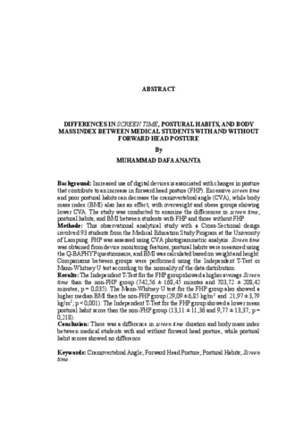 Muhammad Dafa, Ananta (2026) PERBEDAAN SCREEN TIME, KEBIASAAN POSTURAL, DAN INDEKS MASSA TUBUH ANTARA MAHASISWA PENDIDIKAN DOKTER DENGAN DAN TANPA FORWARD HEAD POSTURE. FAKULTAS KEDOKTERAN, UNIVERSITAS LAMPUNG.
