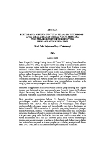 PERTIMBANGAN HUKUM TUNTUTAN PIDANA MATI TERHADAP ANAK SEBAGAI PELAKU TINDAK PIDANA MEMAKSA ANAK MELAKUKAN PERSETUBUHAN YANG MENGAKIBATKAN KEMATIAN (Studi Pada Kejaksaan Negeri Palembang)
