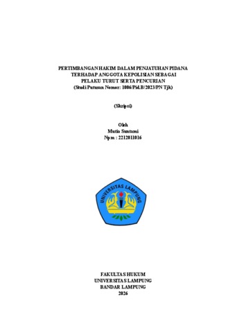 Mutia, Suntami (2026) PERTIMBANGAN HAKIM DALAM PENJATUHAN PIDANA TERHADAP ANGGOTA KEPOLISIAN SEBAGAI PELAKU TURUT SERTA PENCURIAN (Studi Putusan Nomor: 1006/Pid.B/2023/PN Tjk). FAKULTAS HUKUM, UNIVERSITAS LAMPUNG.