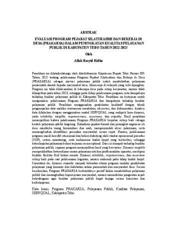 Penelitian ini dilatarbelakangi oleh diterbitkannya Keputusan Bupati Tebo Nomor 891 Tahun 2022 tentang pelaksanaan Program Pejabat Silaturahmi dan Bekerja di Desa (PRAKARSA) sebagai inovasi pelayanan publik untuk mendekatkan pelayanan pemerintah daerah kepada masyarakat desa, khususnya di wilayah yang sulit dijangkau. Program ini telah dilaksanakan di beberapa desa pada setiap kecamatan, namun tidak dilanjutkan pada tahun 2023, sehingga perlu dikaji pelaksanaan program serta dampaknya terhadap kualitas pelayanan publik di Kabupaten Tebo. Penelitian ini bertujuan untuk menganalisis pelaksanaan Program PRAKARSA dan dampaknya terhadap kualitas pelayanan publik. Penelitian menggunakan pendekatan kualitatif dengan teknik pengumpulan data melalui wawancara mendalam, observasi, dan dokumentasi. Analisis data dilakukan dengan menggunakan model SERVQUAL yang meliputi lima dimensi, yaitu reliability, tangible, responsiveness, assurance, dan empathy. Hasil penelitian menunjukkan bahwa pelaksanaan Program PRAKARSA berjalan cukup baik sebagai bentuk pelayanan publik langsung. Kehadiran pejabat daerah dan perangkat organisasi di desa membuka ruang komunikasi dua arah, mempermudah akses pelayanan, serta memungkinkan identifikasi persoalan masyarakat secara cepat. Namun, pelaksanaan program masih bersifat situasional dan belum didukung oleh standar operasional prosedur (SOP), sistem monitoring, serta mekanisme tindak lanjut yang terstruktur, sehingga keberlanjutan pelayanan belum terjamin secara optimal. Dari sisi dampak terhadap kualitas pelayanan publik, capaian program menunjukkan hasil yang bervariasi. Dimensi tangible memperlihatkan ketersediaan sarana pelayanan inti dan profesionalitas aparatur, meskipun kualitas fasilitas fisik belum merata. Dimensi reliability, responsiveness, dan assurance cukup baik pada saat pelaksanaan kegiatan, namun melemah pada tahap tindak lanjut. Sementara itu, dimensi empathy menjadi kekuatan utama program melalui pendekatan pelayanan yang humanis dan kedekatan antara pemerintah dan masyarakat desa. Secara keseluruhan, Program PRAKARSA berkontribusi positif dalam mendekatkan pelayanan publik dan meningkatkan kepercayaan masyarakat, namun memerlukan penguatan aspek kelembagaan agar kualitas pelayanan publik dapat terjaga secara konsisten dan berkelanjutan. Kata kunci: Program PRAKARSA, Pelayanan Publik, Kualitas Pelayanan, SERVQUAL, Kabupaten Tebo. This research is motivated by the issuance of Tebo Regent Decree Number 891 of 2022 concerning the implementation of the Officials' Meeting and Working in Villages (PRAKARSA) Program as a public service innovation to bring local government services closer to village communities, especially in hard-to-reach areas. This program has been implemented in several villages in each subdistrict, but was discontinued in 2023, necessitating a study of the program's implementation and its impact on the quality of public services in Tebo Regency. This study aims to analyze the implementation of the PRAKARSA Program and its impact on the quality of public services. The study used a qualitative approach with data collection techniques through in-depth interviews, observation, and documentation. Data analysis was conducted using the SERVQUAL model, which includes five dimensions: reliability, tangibles, responsiveness, assurance, and empathy. The results showed that the implementation of the PRAKARSA Program was quite successful as a form of direct public service. The presence of local officials and organizational staff in villages opened up two-way communication, facilitated access to services, and enabled rapid identification of community problems. However, program implementation remains situational and lacks support from standard operating procedures (SOPs), a monitoring system, and a structured follow-up mechanism, thus ensuring optimal service continuity. In terms of impact on public service quality, program outcomes vary. The tangible dimension demonstrates the availability of core service facilities and the professionalism of staff, although the quality of physical facilities is uneven. The reliability, responsiveness, and assurance dimensions performed well during implementation but weakened during the follow-up phase. Meanwhile, empathy is the program's primary strength, fostering a humanistic approach to service delivery and fostering closeness between the government and village communities. Overall, the PRAKARSA Program has made a positive contribution to bringing public services closer and increasing public trust, but requires institutional strengthening to ensure consistent and sustainable service quality. Keywords: PRAKARSA Programme, Public Services, Service Quality, SERVQUAL, Tebo Regency,