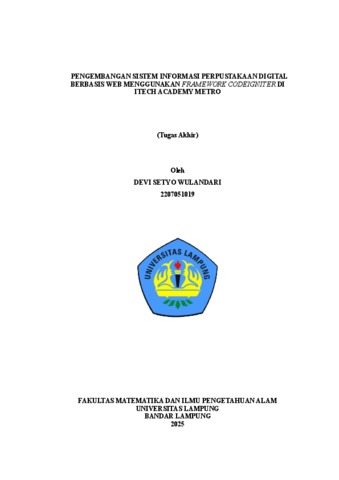 DEVI , SETYO WULANDARI (2025) PENGEMBANGAN SISTEM INFORMASI PERPUSTAKAAN DIGITAL BERBASIS WEB MENGGUNAKAN FRAMEWORK CODEIGNITER DI ITECH ACADEMY METRO. [Diploma/Tugas Akhir]