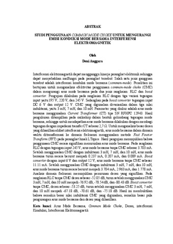 Interferensi elektromagnetik dapat mengganggu kinerja perangkat elektronik sehingga dapat menyebabkan malfungsi pada perangkat tersebut. Salah satu jenis gangguan tersebut adalah interferensi konduksi mode bersama (common-mode). Penelitian ini bertujuan untuk menganalisis efektivitas penggunaan common-mode choke (CMC) dalam mengurangi arus mode bersama pada dua jenis rangkaian: RLC dan boost converter. Pengujian dilakukan pada rangkaian RLC dengan tiga variasi tegangan input yaitu 195 V, 220 V, dan 245 V. Sedangkan pada boost converter tegangan input DC 6 V dan output 12 V. CMC yang digunakan divariasikan dalam tiga nilai induktansi, yaitu 3 mH, 7 mH, dan 10 mH. Parameter yang diukur adalah arus mode bersama menggunakan Current Transformer (CT) tipe SN RFHPC 12943. Hasil pengukuran ditampilkan pada osiloskop dalam bentuk gelombang tegangan mode bersama, sehingga untuk mendapatkan arus mode bersama dilakukan dengan membagi tegangan dengan impedansi transfer CT sebesar 2,7 Ω. Untuk menganalisis besar derau yang dihasilkan akibat interferensi elektromagnetik, arus mode bersama dalam domain waktu ditransformasi ke domain frekuensi menggunakan metode Fast Fourier Transform (FFT) pada perangkat lunak LTspice. Hasil pengujian menunjukkan bahwa penggunaan CMC secara signifikan menurunkan arus mode bersama. Pada rangkaian RLC dengan tegangan input 245 V, arus mode bersama tanpa CMC sebesar 3.703 mA. Setelah menggunakan CMC dengan induktansi 3 mH, 7 mH, dan 10 mH, arus mode bersama turun secara berurut menjadi 0.237 mA, 0.207 mA, dan 0.089 mA. Boost converter dengan input 6 V dan output 12 V, arus mode bersama tanpa CMC sebesar 11.11 mA. Setelah menggunakan CMC dengan induktansi 3 mH, 7 mH, dan 10 mH, arus mode bersama turun secara berurut menjadi 3.704 mA, 2.963 mA, dan 1.778 mA. Analisis domain frekuensi menunjukkan penurunan derau yang signifikan. Pada rangkaian RLC tanpa CMC derau sebesar -52.05 dB, turun setelah menggunakan CMC 3 mH, 7 mH, dan 10 mH menjadi -76.92 dB, -78.54 dB, dan -80.43 dB. Boost converter tanpa CMC, derau sebesar -53.25 dB, turun setelah menggunakan CMC 3 mH, 7 mH, dan 10 mH menjadi -67.18 dB, -70.61 dB, dan -75.18 dB. Hasil ini membuktikan bahwa semakin besar nilai induktansi CMC yang digunakan, semakin besar pula pengurangan arus mode bersama dan derau yang dihasilkan. Kata kunci: Arus Mode Bersama, Common Mode Choke, Derau, interferensi Konduksi, Interferensi Elektromagnetik Electromagnetic interference can disrupt the performance of electronic devices, causing them to malfunction. One type of interference is common-mode conduction interference. This study aims to analyze the effectiveness of using a common-mode choke (CMC) in reducing common-mode current in two types of circuits: RLC and boost converters. Tests were conducted on the RLC circuit with three input voltage variations: 195 V, 220 V, and 245 V. For the boost converter, the input voltage was 6 V DC, and the output was 12 V. The CMC used had three inductance values: 3 mH, 7 mH, and 10 mH. The measured parameter was common-mode current using a Current Transformer (CT) type SN RFHPC 12943. The measurement results were displayed on an oscilloscope in the form of common-mode voltage waves. To obtain the common- mode current, the voltage was divided by the CT transfer impedance of 2.7 Ω. To analyze the magnitude of noise generated due to electromagnetic interference, the common-mode current in the time domain is converted to the frequency domain using the Fast Fourier Transform (FFT) method in LTspice software. The test results show that the use of CMC significantly reduces the common-mode current. In an RLC circuit with an input voltage of 245 V, the common-mode current without CMC is 3.703 mA. After using CMC with inductances of 3 mH, 7 mH, and 10 mH, the common-mode current decreases sequentially to 0.237 mA, 0.207 mA, and 0.089 mA. In a boost converter with an input of 6 V and an output of 12 V, the common-mode current without CMC is 11.11 mA. After using CMC with inductances of 3 mH, 7 mH, and 10 mH, the common-mode current decreases sequentially to 3.704 mA, 2.963 mA, and 1.778 mA. Frequency domain analysis shows a significant reduction in noise. In the RLC circuit without CMC, the noise level is -52.05 dB, which decreases after using CMC 3 mH, 7 mH, and 10 mH to -76.92 dB, -78.54 dB, and -80.43 dB, respectively. In the boost converter without CMC, the noise level was -53.25 dB, which decreased after using CMC 3 mH, 7 mH, and 10 mH to -67.18 dB, -70.61 dB, and -75.18 dB, respectively. These results demonstrate that the larger the inductance value of the CMC used, the greater the reduction in common-mode current and noise generated. Keywords: Common Mode Current, Common Mode Choke, Noise, Conducted Interference, Electromagnetic Interference