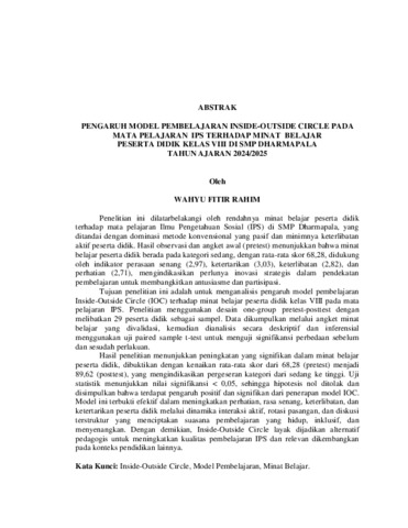 WAHYU , FITIR RAHIM (2025) PENGARUH MODEL PEMBELAJARAN INSIDE-OUTSIDE CIRCLE PADA MATA PELAJARAN IPS TERHADAP MINAT BELAJAR PESERTA DIDIK KELAS VIII DI SMP DHARMAPALA TAHUN AJARAN 2024/2025. FAKULTAS KEGURUAN DAN ILMU PENDIDIKAN , UNIVERSITAS LAMPUNG.