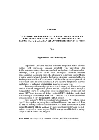 Departemen Kesehatan Republik Indonesia menyatakan bahwa diabetes melitus (DM) merupakan gangguan metabolik yang disebabkan oleh ketidakmampuan pankreas dalam memproduksi insulin dalam jumlah yang cukup. Akibatnya, kadar glukosa dalam darah meningkat. Indonesia memiliki keanekaragaman hayati yang melimpah, salah satunya damar mata kucing (Shorea javanica) yang tersebar di Sumatera dan berpotensi sebagai tanaman obat karena kandungan senyawa bioaktif di dalamnya. Penelitian ini bertujuan mengidentifikasi senyawa dari fraksi etil asetat kulit batang S. javanica serta mengevaluasi aktivitas antidiabetesnya melalui uji inhibisi enzim α-amilase secara in vitro. Tahapan penelitian meliputi proses ekstraksi sampel yang dilakukan dengan metode maserasi menggunakan pelarut metanol, dilanjutkan partisi bertingkat menggunakan pelarut etil asetat, isolasi senyawa dengan metode kromatografi cair vakum (KCV) dan kromatografi kolom gravitasi (KKG), dilakukan karakterisasi senyawa dengan sprektroskopi NMR dan LC-MS/MS. Uji aktivitas antidiabetes dilakukan secara in vitro menggunakan enzim α-amilase. Hasil analisis 1H-NMR menunjukkan bahwa senyawa NVI 10 hasil isolasi diprediksi merupakan senyawa golongan stilbenoid berupa trimer resveratrol. Data LC-MS/MS menunjukkan waktu retensi sebesar 7,71 menit dan nilai m/z 679,1958 dan prediksi rumus molekul C42H30O9. Uji aktivitas antidiabetes terhadap enzim α- amilase menunjukkan bahwa senyawa NVI 10 tersebut memiliki aktivitas sedang, dengan nilai IC50 sebesar 149,69 μg/mL. Kata Kunci: Shorea javanica, metabolit sekunder, antidiabetes, α-amilase The Indonesian Ministry of Health states that diabetes mellitus (DM) is a metabolic disorder caused by the pancreas's inability to produce sufficient insulin, resulting in elevated blood glucose levels. Indonesia possesses abundant biodiversity, one of which is the mata kucing resin (Shorea javanica), widely distributed in Sumatra and considered a potential medicinal plant due to its bioactive compound content. This study aims to identify compounds from the ethyl acetate fraction of S. javanica stem bark and to evaluate their antidiabetic activity through in vitro α-amylase enzyme inhibition assay. The research stages included sample extraction using the maceration method with methanol solvent, followed by liquid-liquid partitioning using ethyl acetate. Compound isolation was conducted using vacuum liquid chromatography (VLC) and gravity column chromatography (GCC). The isolated compound was then characterized using NMR spectroscopy and LC-MS/MS analysis. The antidiabetic activity assay was performed in vitro using the α-amylase enzyme. The 1H-NMR analysis suggestes that the isolated compound NVI 10 is predicted to be a stilbenoid compound in the form of a resveratrol trimer. LC- MS/MS data showed a retention time of 7.71 minutes with an m/z value of 679.1958 and a predicted molecular formula of C42H30O9. The α-amylase enzyme assay revealed that compound NVI 10 exhibited moderate antidiabetic activity, with an IC50 value of 149.69 μg/mL. Keywords: Shorea javanica, secondary metabolite compounds, antidiabetic, α- amilase