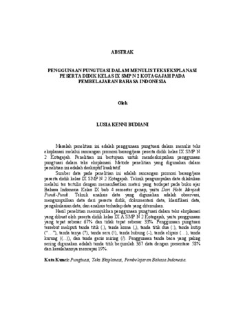 Masalah penelitian ini adalah penggunaan pungtuasi dalam menulis teks eksplanasi melalui rancangan promosi barang/jasa peserta didik kelas IX SMP N 2 Kotagajah. Penelitian ini bertujuan untuk mendeskripsikan penggunaan pungtuasi dalam teks eksplanasi. Metode penelitian yang digunakan dalam penelitian ini adalah deskriptif kualitatif. Sumber data pada penelitian ini adalah rancangan promosi barang/jasa peserta didik kelas IX SMP N 2 Kotagajah. Teknik pengumpulan data dilakukan melalui tes tertulis dengan memanfaatkan materi yang terdapat pada buku ajar Bahasa Indonesia Kelas IX bab 4 semester genap, yaitu Dari Hobi Menjadi Pundi-Pundi. Teknik analisis data yang digunakan adalah observasi, mengumpulkan data dari peserta didik, dokumentasi data, klasifikasi data, pengakulasian data, dan analisis terhadap data yang ditemukan. Hasil penelitian menunjukkan penggunaan pungtuasi dalam teks eksplanasi yang dibuat oleh peserta didik kelas IX A SMP N 2 Kotagajah, yaitu penggunaan yang tepat sebesar 67% dan tidak tepat sebesar 33%. Penggunaan pungtuasi tersebut meliputi tanda titik (.), tanda koma (,), tanda titik dua (:), tanda kutip (“...”), tanda tanya (?), tanda seru (!), tanda hubung (-), tanda elipsis (...), tanda kurung ((...)), dan tanda garis miring (/). Penggunaan tanda baca yang paling sering digunakan adalah tanda titik berjumlah 367 data dengan presentase 58% dan kesalahannya mencapai 19%. Kata Kunci: Pungtuasi, Teks Eksplanasi, Pembelajaran Bahasa Indonesia. The problem of this research is the use of punctuation in writing explanatory texts through promotional designs of products/services by grade IX students of SMP N 2 Kotagajah. This study aims to describe the use of punctuation in explanatory texts. The research method used in this study is descriptive qualitative. The data source for this study was the promotional designs of grade IX students of SMP N 2 Kotagajah. Data collection was conducted through a written test utilizing material contained in the Indonesian Language textbook for Grade IX, Chapter 4, even semester, entitled "From Hobby to Income." The data analysis techniques used were observation, collecting data from students, data documentation, data classification, data accumulation, and analysis of the data found. The results of the study showed that the use of punctuation in explanatory texts written by grade IX A students at SMP N 2 Kotagajah was correct at 67% and incorrect at 33%. These punctuation marks included periods (.), commas (,), colons (:), quotation marks ("..."), question marks (?), exclamation points (!), hyphens (-), ellipsis (...), parentheses ((...)), and slashes (/). The most frequently used punctuation mark was the period, with 367 entries, accounting for 58% of the data,