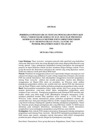 PERBEDAAN PENGETAHUAN TENTANG PENCEGAHAN PENYAKIT TINEA VERSICOLO R SEBELUM DAN SESUDAH PROMOSI KESEHATAN DENGAN METODE FOCUS GROUP DISCUSSION DAN DEMONSTRASI PADA SANTRI DI PONDOK PESANTREN DARUT TILAWAH
