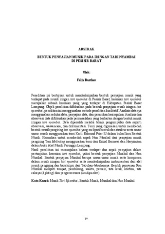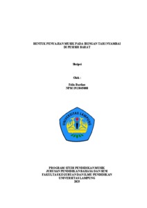 Penelitian ini bertujuan untuk mendeskripsikan bentuk penyajian musik yang terdapat pada musik iringan tari nyambai di Pesisir Barat, kesenian tari nyambai merupakan sebuah kesenian yang yang terdapat di Kabupaten Pesisir Barat Lampung. Objek penelitian difokuskan pada bentuk penyajian musik iringan tari nyambai, penelitian ini menggunakan metode penelitian kualitatif. Analisis datanya menggunakan reduksi data, penyajian data, dan penarikan kesimpulan. Analisis dan observasi data difokuskan pada permasalahan yang berkaitan dengan bentuk musik iringan tari nyambai. Data diperoleh melalui teknik pengumpulan data seperti observasi, wawancara, dan dokumentasi. Teori yang digunakan untuk membedah bentuk musik pengiring tari nyambai yang meliputi bentuk dan struktur serta unsur unsur musik menggunakan teori Karl- Edmund Prier SJ dalam buku Ilmu Bentuk Musik. Kemudian untuk membedah aspek Non Musikal dari penyajian musik pengiring Tari Melinting menggunakan teori dari Erizal Barnawi dan Hasyimkan dalam buku Alat Musik Perunggu Lampung. Hasil penelitian ini menunjukan bahwa terdapat dua aspek penyajian dalam pertunjukan kesenian tari nyambai, yakni bentuk penyajian Musikal dan Non Musikal. Bentuk penyajian Musikal berupa unsur-unsur musik serta komponen dalam musik iringan tari nyambai serta mendeskripsikan instrumentasi dari alat musik pengiring dan transkripsi dari Tabuhan-tabuhannya. Bentuk penyajian Non Musikal meliputi tempat, pendukung, waktu, pemain, tata letak, kostum, tata cahaya (lighting) dan pengeras suara (loudspeaker). Kata Kunci: Musik Tari Nyambai, Bentuk Musik, Musikal dan Non Musikal This research aims to describe the form of musical presentation in the accompaniment of the Nyambai dance in Pesisir Barat. The Nyambai dance is a traditional art form found in Pesisir Barat Regency, Lampung. The object of the study is focused on the form of musical presentation in the Nyambai dance accompaniment. This research employs a qualitative method. Data analysis involves data reduction, data presentation, and drawing conclusions. The analysis and data observation are centered on issues related to the musical form of the Nyambai dance accompaniment. Data were collected through techniques such as observation, interviews, and documentation. The theory used to examine the musical form of the Nyambai dance accompaniment, including its structure and musical elements, is Karl-Edmund Prier SJ’s theory from the book Ilmu Bentuk Musik (The Science of Musical Form). To analyze the non-musical aspects of the musical presentation accompanying the Melinting dance, the study uses theories from Erizal Barnawi and Hasyimkan in the book Alat Musik Perunggu Lampung (Bronze Musical Instruments of Lampung). The results of this study indicate that there are two aspects of presentation in the Nyambai dance performance: musical and non-musical. The musical presentation consists of musical elements and components within the dance accompaniment, including a description of the instruments used and the transcription of the rhythmic patterns (tabuhan). The non-musical presentation includes aspects such as the venue, supporting elements, timing, performers, layout, costumes, lighting, and sound system. Keywords: Nyambai Dance Music, Musical Form, Musical and Non-Musical.
