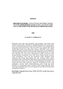 Pengenalan emosi pada suara merupakan tugas kompleks yang krusial untuk interaksi manusia-mesin. Penelitian ini mengimplementasikan dan mengevaluasi model Convolutional Recurrent Neural Network (CRNN) yang menggabungkan keunggulan Convolutional Neural Network (CNN) untuk ekstraksi fitur spasial dengan Bidirectional Long Short-Term Memory (BiLSTM) untuk analisis dependensi temporal. Model ini dilatih dan diuji menggunakan dataset CREMA-D, yang mencakup enam kelas emosi: marah, jijik, takut, bahagia, netral, dan sedih. Fitur diekstraksi dari sinyal audio menggunakan log-Mel spectrogram untuk merepresentasikan karakteristik suara yang relevan dengan persepsi manusia. Untuk meningkatkan variasi data dan generalisasi model, diterapkan teknik augmentasi data berupa pitch shifting dan time stretching. Hasil evaluasi menunjukkan bahwa model CRNN yang didukung dengan augmentasi data berhasil mencapai akurasi validasi sebesar 68.23%, sebuah peningkatan dari 66.08% yang dicapai oleh model tanpa augmentasi. Model ini menunjukkan performa yang menjanjikan, terutama dalam mengklasifikasikan emosi marah dan netral. Penelitian ini menyimpulkan bahwa arsitektur CRNN dengan BiLSTM efektif untuk tugas pengenalan emosi suara, dan augmentasi data berperan penting dalam meningkatkan kinerjanya. Kata Kunci: Pengenalan Emosi Suara, CRNN, BiLSTM, Log-Mel Spectrogram, Augmentasi Data. Speech emotion recognition is a complex task crucial for human-machine interaction. This study implements and evaluates a Convolutional Recurrent Neural Network (CRNN) model that combines the advantages of a Convolutional Neural Network (CNN) for spatial feature extraction with Bidirectional Long Short-Term Memory (BiLSTM) for temporal dependency analysis. The model is trained and tested using the CREMA-D dataset, which includes six emotion classes: anger, disgust, fear, happiness, neutral, and sadness. Features are extracted from the audio signals using log-Mel spectrograms to represent sound characteristics relevant to human perception. To enhance data variation and model generalization, data augmentation techniques such as pitch shifting and time stretching were implemented. The evaluation results show that the CRNN model with data augmentation achieved a validation accuracy of 68.23%, an increase from the 66.08% achieved by the model without augmentation. The model shows promising performance, especially in classifying the anger and neutral emotions. This study concludes that the CRNN architecture with BiLSTM is effective for the task of speech emotion recognition, and that data augmentation plays a crucial role in enhancing its performance. Keywords: Speech Emotion Recognition, CRNN, BiLSTM, Log-Mel Spectrogram, Data Augmentation.
