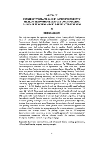 ABSTRACT CONSTRUCTIVISM APPROACH IN IMPROVING STUDENTS’ SPEAKING PERFORMANCETHROUGH COMMUNICATIVE LANGUAGE TEACHING AND SELF-REGULATED LEARNING By DILI NILAKANDI This study investigates the significant difference of two Learning Model Developments based on Constructivism through Communicative Language Teaching (CLT) and Constructivism through Self-Regulated Learning (SRL) in improving students’ communicative speaking performance. The research was motivated by the persistent challenges senior high school students face in speaking English, including low confidence, limited vocabulary retrieval, weak idea organization, and the absence of appropriate learning strategies. To address these issues, this study implemented two pedagogical interventions that combined Constructivism principles with different instructional orientations: interaction-based learning (CLT) and strategic-metacognitive learning (SRL). The study employed a quantitative approach using a quasi-experimental design with two experimental classes. Both groups received treatment based on Constructivist learning cycles but with distinct techniques. The CLT-based model applied interaction-focused activities such as Information Gap, Game Card Pair, Opinion Corner, and Role Play to strengthen communicative fluency. Meanwhile, the SRL-based model incorporated techniques including Metacognitive Strategy Training, Think-Aloud, KWL Charts, Fishbowl Discussion, Post-Task Reflection, and Play Rotation Discussion to enhance learners’ planning, monitoring, and evaluation skills. Data were collected through speaking performance tests administered in the pre-test and post-test phases, and the results were analyzed using the Independent Samples T-Test. The findings revealed a statistically significant difference between the post-test scores of the two experimental groups (p = 0.034). Students taught through the Constructivism–SRL model achieved higher mean scores (M = 17.83) than those taught through the Constructivism and CLT model (M = 17.29). These results indicate that although both models effectively improved students’ speaking performance, the integration of SRL provided stronger gains. The SRL-based model enabled students to develop deeper strategic competence by helping them identify suitable learning strategies, regulate their own learning processes, and overcome speaking challenges such as idea disorganization, pronunciation difficulties, hesitate, less motivation and lexical limitations. In conclusion, the study demonstrates that speaking instruction becomes more effective when Constructivism approach are combined with self-regulated learning components that promote autonomy, metacognitive awareness, and strategic control. The findings suggest that the SRL-integrated Constructivism model can serve as a more impactful approach for improving students’ communicative competence, offering valuable insights for teachers, curriculum developers, and future research on speaking pedagogy. Keywords: Keywords: constructivism, self-determined theory, speaking performance, self-regulated learning language learning strategies.