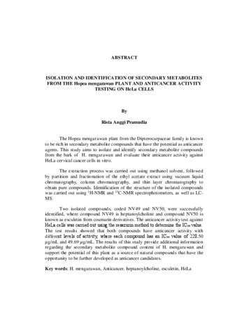 ISOLASI DAN IDENTIFIKASI SENYAWA METABOLIT SEKUNDER DARI TANAMAN Hopea mengarawan SERTA UJI AKTIVITAS ANTIKANKER TERHADAP SEL HeLa