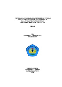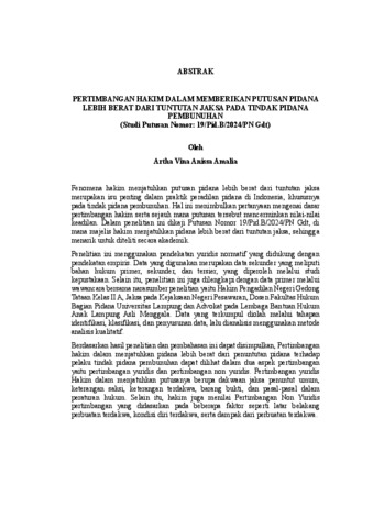 ARTHA VINA , ANISSA AMALIA (2026) PERTIMBANGAN HAKIM DALAM MEMBERIKAN PUTUSAN PIDANA LEBIH BERAT DARI TUNTUTAN JAKSA PADA TINDAK PIDANA PEMBUNUHAN (Studi Putusan Nomor: 19/Pid.B/2024/PN Gdt). FAKULTAS HUKUM, UNIVERSITAS LAMPUNG.