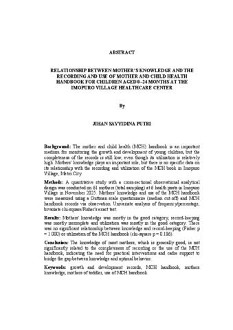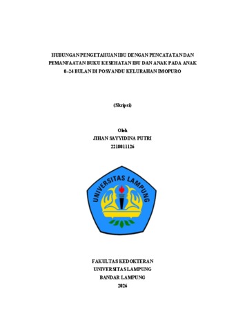 Jihan Sayyidina, Putri (2026) HUBUNGAN PENGETAHUAN IBU DENGAN PENCATATAN DAN PEMANFAATAN BUKU KESEHATAN IBU DAN ANAK PADA ANAK 0–24 BULAN DI POSYANDU KELURAHAN IMOPURO. FAKULTAS KEDOKTERAN, UNIVERSITAS LAMPUNG.