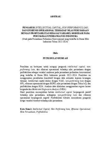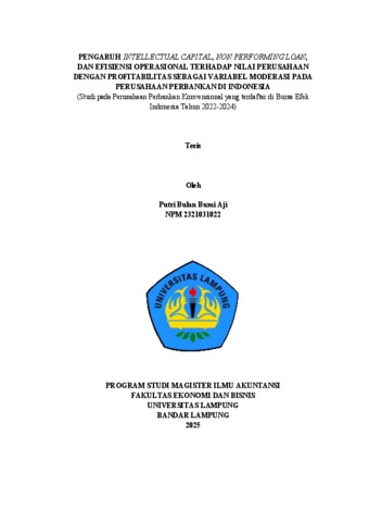 PUTRI , BULAN BUMI AJI (2025) PENGARUH INTELLECTUAL CAPITAL, NON PERFORMING LOAN, DAN EFISIENSI OPERASIONAL TERHADAP NILAI PERUSAHAAN DENGAN PROFITABILITAS SEBAGAI VARIABEL MODERASI PADA PERUSAHAAN PERBANKAN DI INDONESIA (Studi pada Perusahaan Perbankan Konvensional yang terdaftar di Bursa Efek Indonesia Tahun 2022-2024). Masters thesis, UNIVERSITAS LAMPUNG.