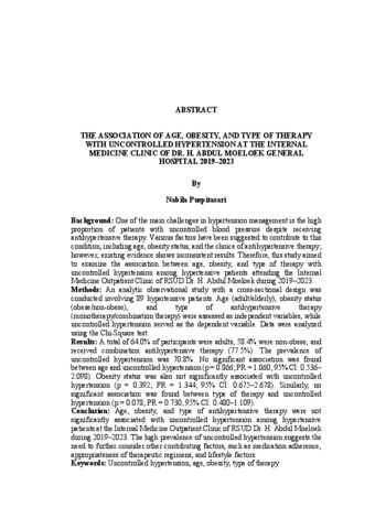HUBUNGAN USIA, OBESITAS, DAN JENIS TERAPI DENGAN KEJADIAN HIPERTENSI TIDAK TERKONTROL DI POLIKLINIK PENYAKIT DALAM RSUD DR. H. ABDUL MOELOEK TAHUN 2019-2023